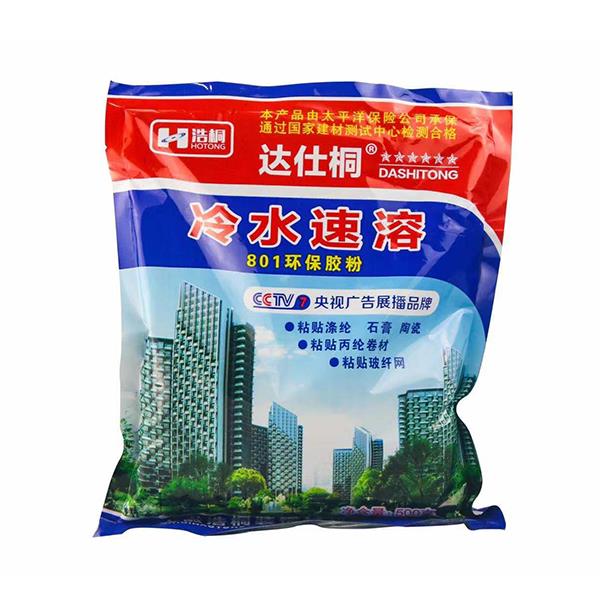 冷水速溶膠粉為白色粉末,不含甲醛、二甲苯和有機揮發物。常溫下即可溶解為膠體,對人體沒有傷害,屬綠色節能產品。該膠粉抗裂耐水性強,硬度高,亮度好,手感光滑柔潤,是用于建筑膠水、仿瓷涂料、內外墻防水抗裂膩子,批刮輕松流暢。不需要加熱,完全采用冷水溶解,工藝簡單。